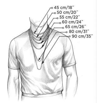 - 50 – 55 cm: Spadá na klíční kost a je to nejběžnější velikost pánských náhrdelníků. Lze nosit uvnitř i vně košile.