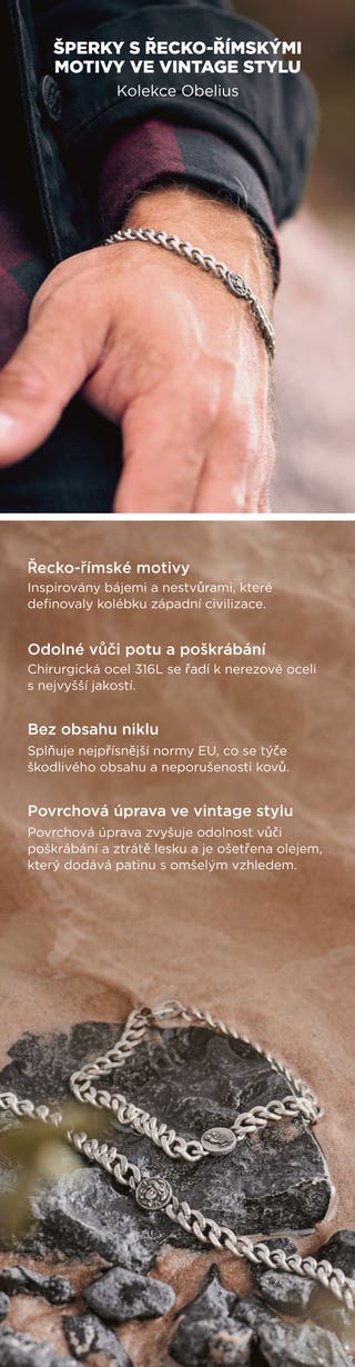 Tento náramek je z nerezové oceli 316L. Má plochý curb řetěz s chladným stříbrným povrchem. Očka jsou přesně tvarovaná a pevně spojena, takže náramek drží jednoduchou siluetu. Malá kulatá medailonka s jemným rytím tvoří decentní středový prvek. Vzhled je čistý a moderní s lehkým industriálním nádechem.