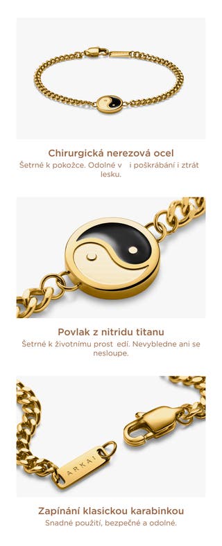 Náramek je vyroben z nerezové oceli 316L s lesklou zlatou úpravou a uprostřed má nízký, nenápadný disk s motivem jin a jang. Úzký řetízek tvoří těsné, zaoblené články pro hladký profil a černo-zlatý motiv dodává jemný kontrast. Má karabinku a malou identifikační destičku pro pevné a uhlazené zapínání.