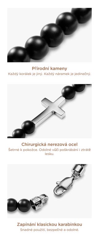 Lesklé černé kuličky z onyxu a detaily z nerezové oceli 316L vytvářejí čistý, moderní vzhled náramku. Vodorovný křížek z nerezové oceli je zasazen mezi korálky jako nenápadný středový prvek. Hladké povrchy kamene i kovu působí uhlazeně.